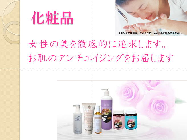 取り扱っている商品は化粧品・全身洗浄剤・育毛剤・保水ジェルなどの消耗品です。